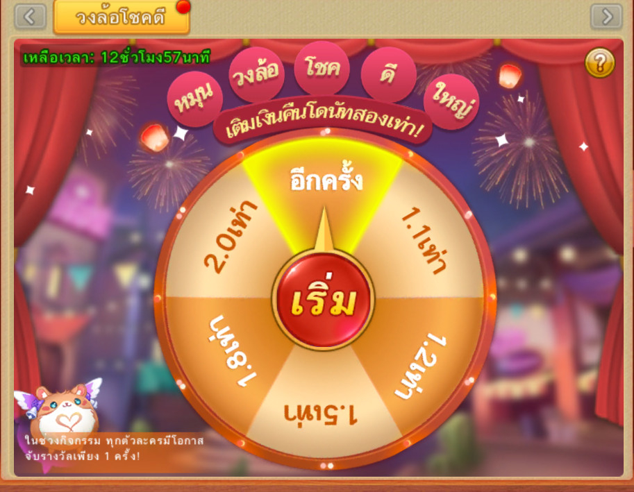 เมื่อผู้เล่นทำการหมุนวงล้อจะทำการสุ่มได้รับโบนัสคืน*สูงสุดรวม 2 เท่า หลังจากสุ่มได้รับโบนัสคืนแล้ว หลังจากนั้น หากทำการเติมเงินก็จะได้รับโบนัสคืนตามจำนวนที่สุ่มได้ ซึ่งโบนัสจะเป็น โดนัทล็อค(คูปองสีเขียว) ทุกตัวละครจะมีโอกาสจับได้แค่เพียง 1 ครั้งเท่านั้น