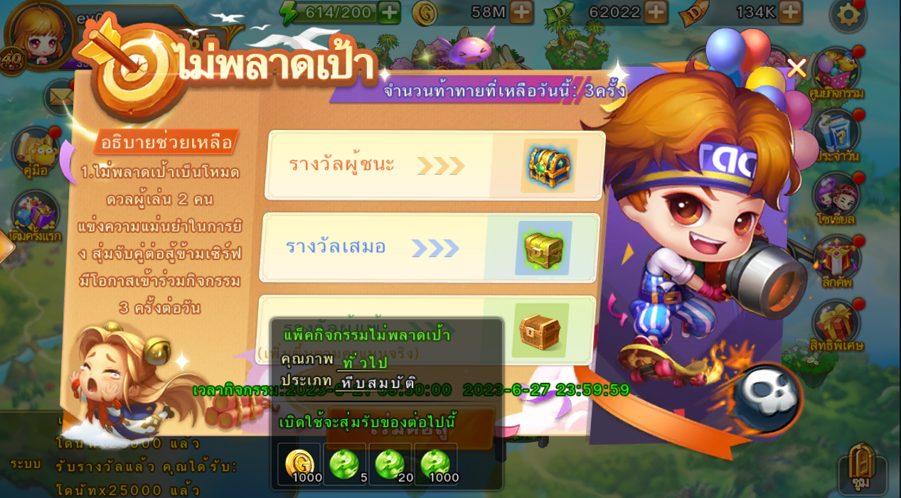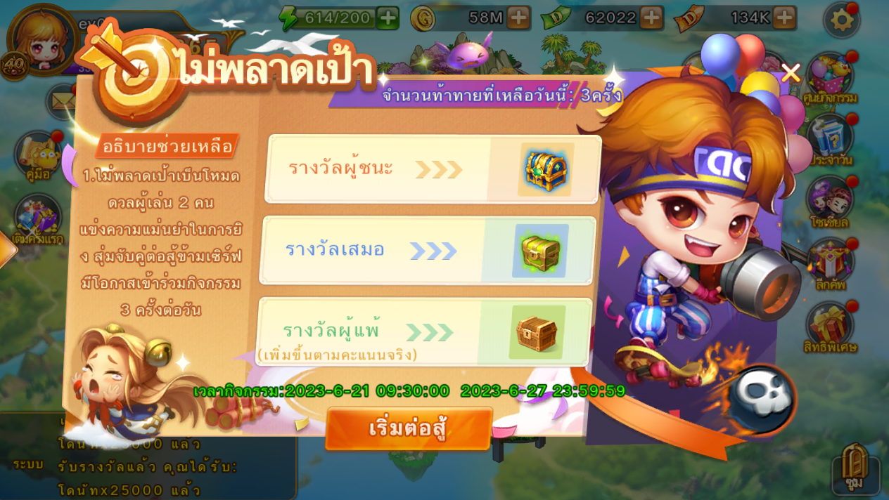 1.ไม่พลาดเป้าเป็นโหมดดวลผู้เล่น 2 คน แข่งความแม่นยำในการยิง สุ่มจับคู่ข้ามเซิร์ฟ เข้าร่วมได้วันละ 3 ครั้ง จะเริ่มทุกวันเวลา 17.00-22.00 น.