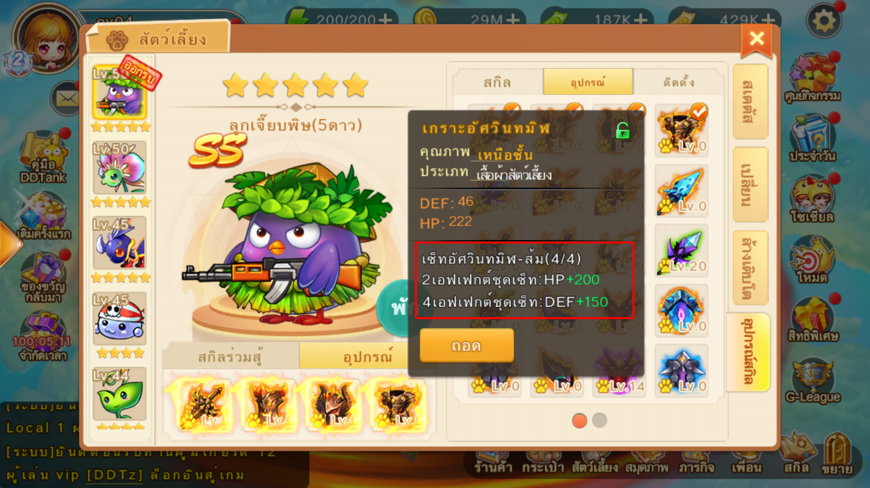 - เมื่อใส่ ครบ 4 ชิ้น จะได้รับ เอฟเฟกต์ชุดเซ็ท เพิ่มค่า DEF