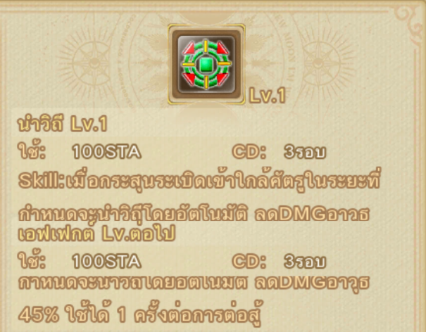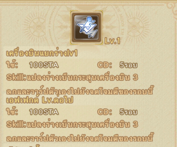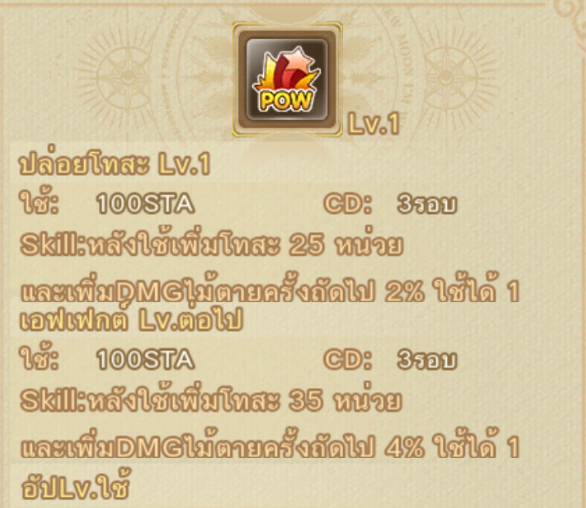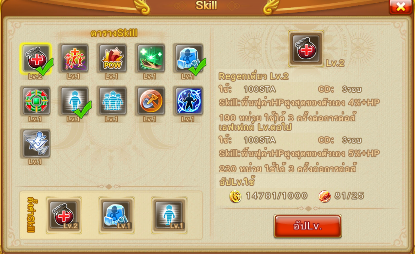 หมายเหตุ : เมื่อกดใช้แล้วจะเพิ่มเกจเท่ากับหน่วยที่ Lv. สกิลกำหนด ไม่ใช่กดใช้แล้วเกจจะเต็ม