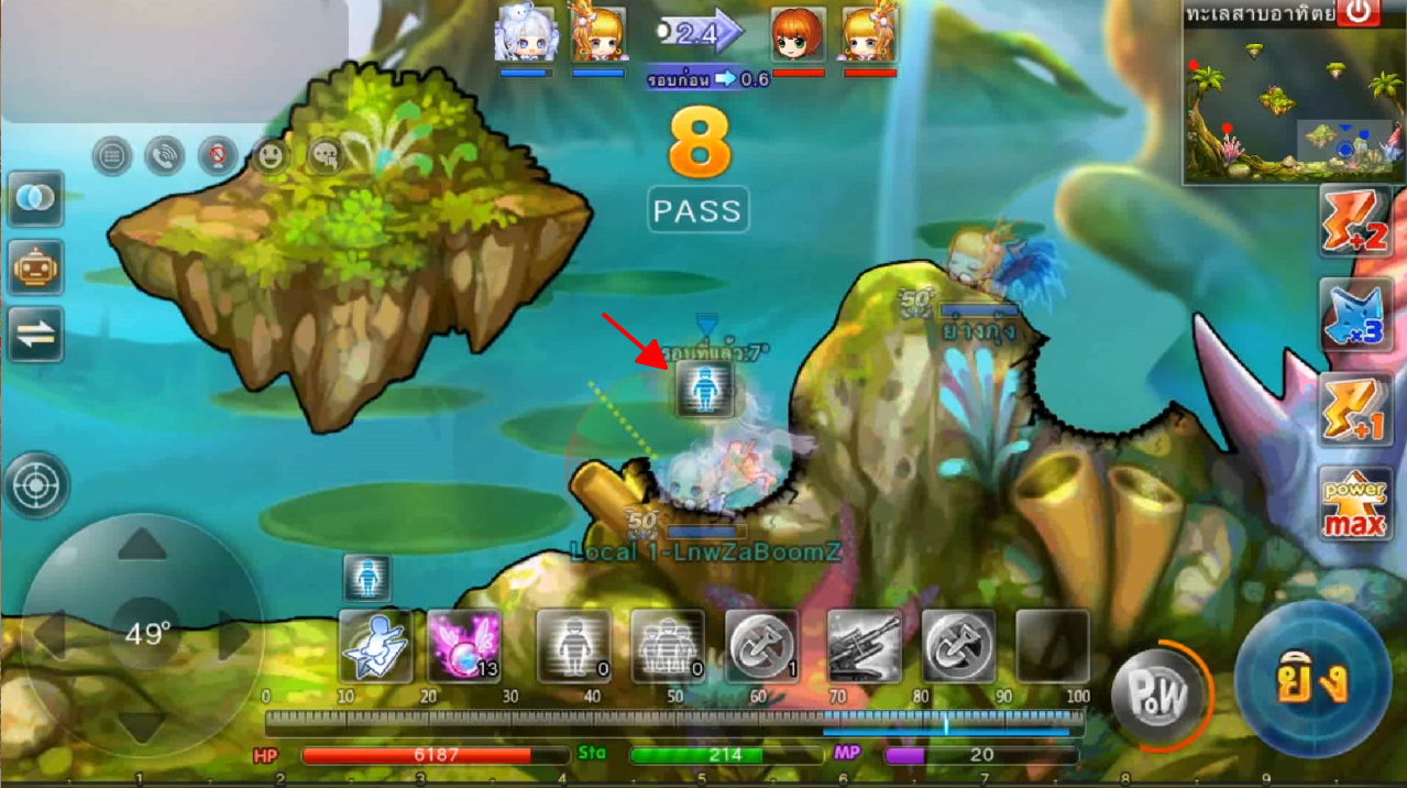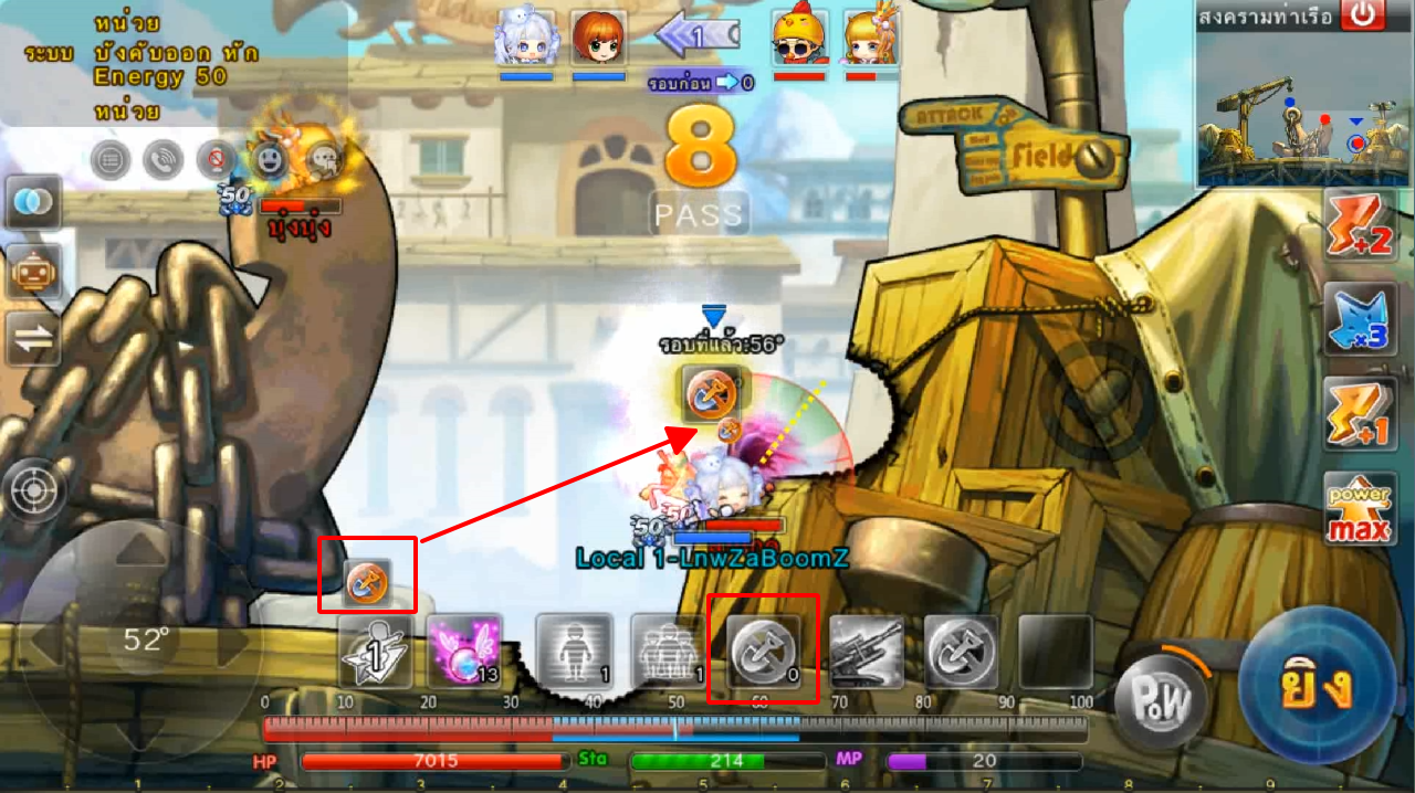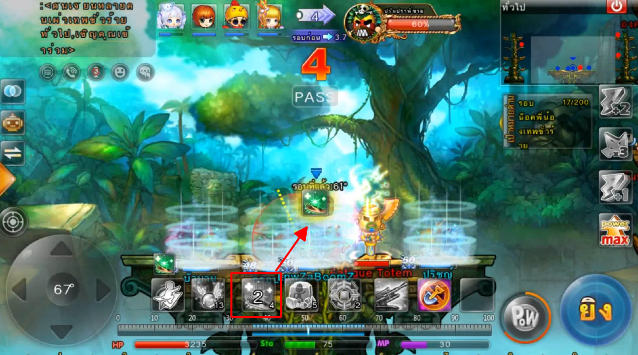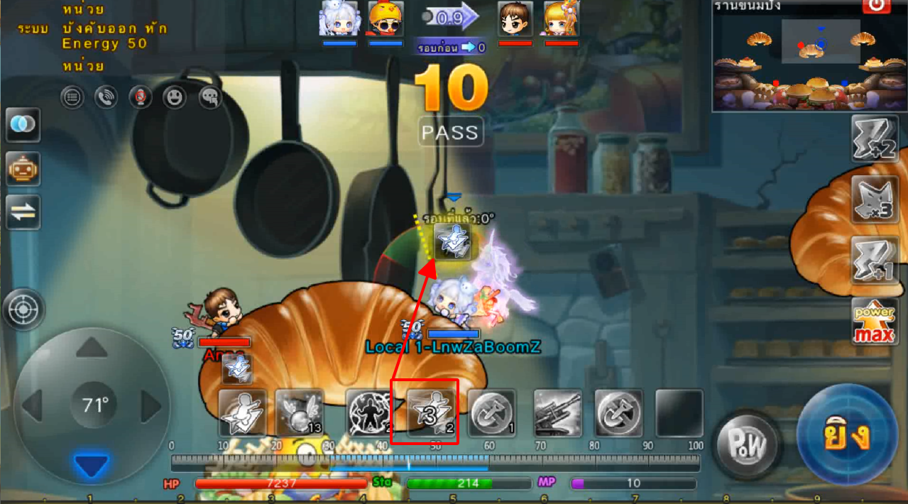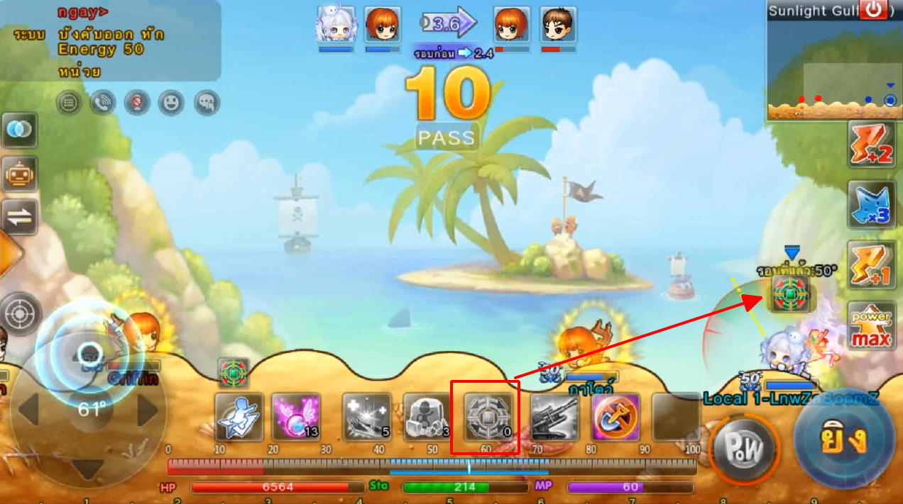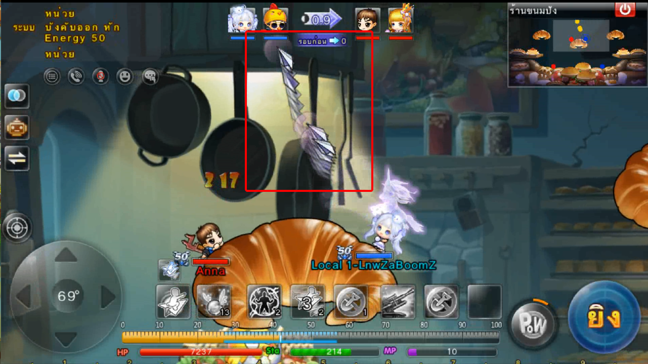 ในภาพใช้สกิลและกดใช้ไอเทม ปา 3 นัด เมื่ออาวุธตกใกล้เป้าหมายจะทำการล็อคเป้าหมายและพุ่งเข้าไปหาเป้าหมายทันที