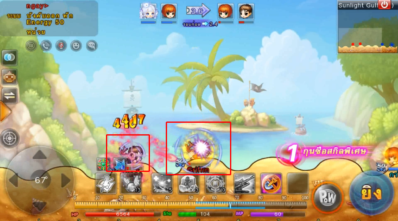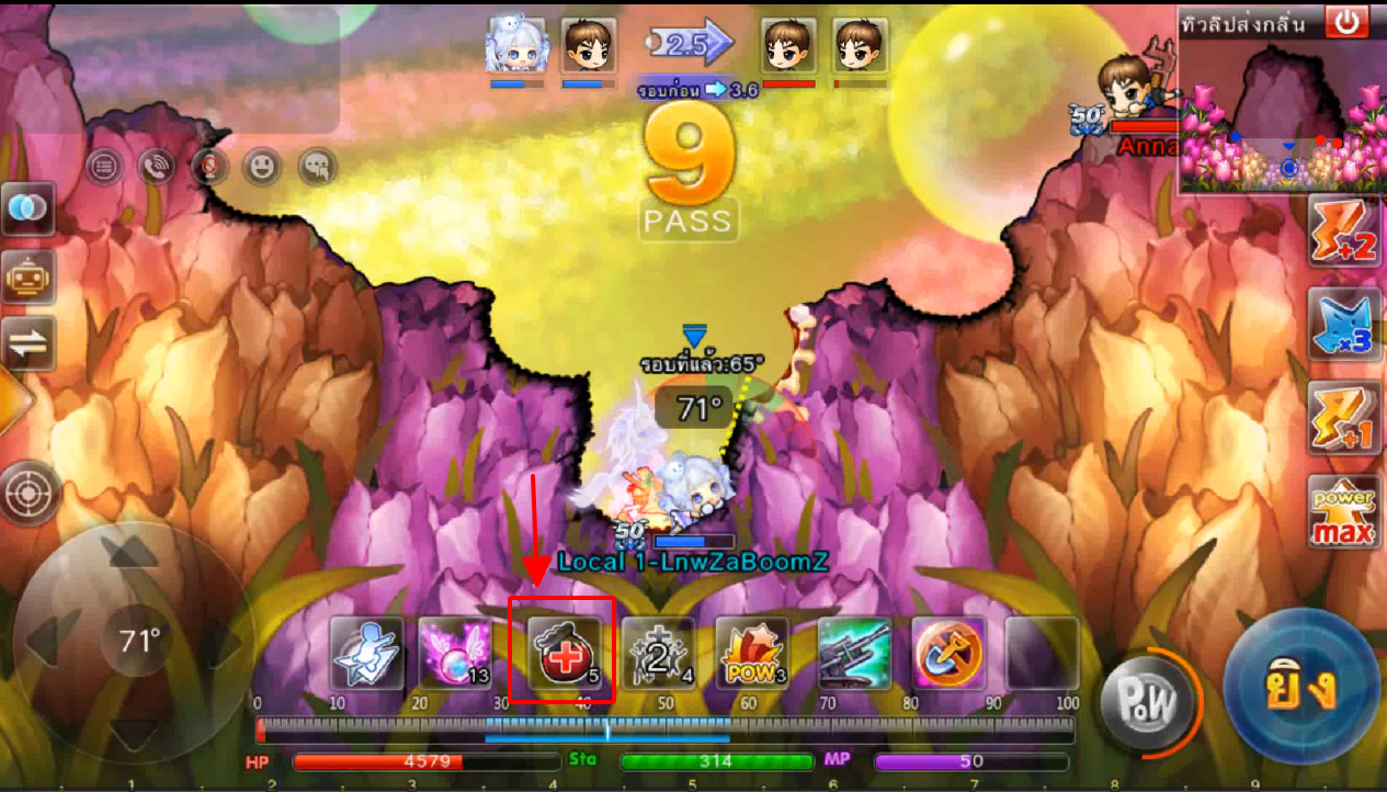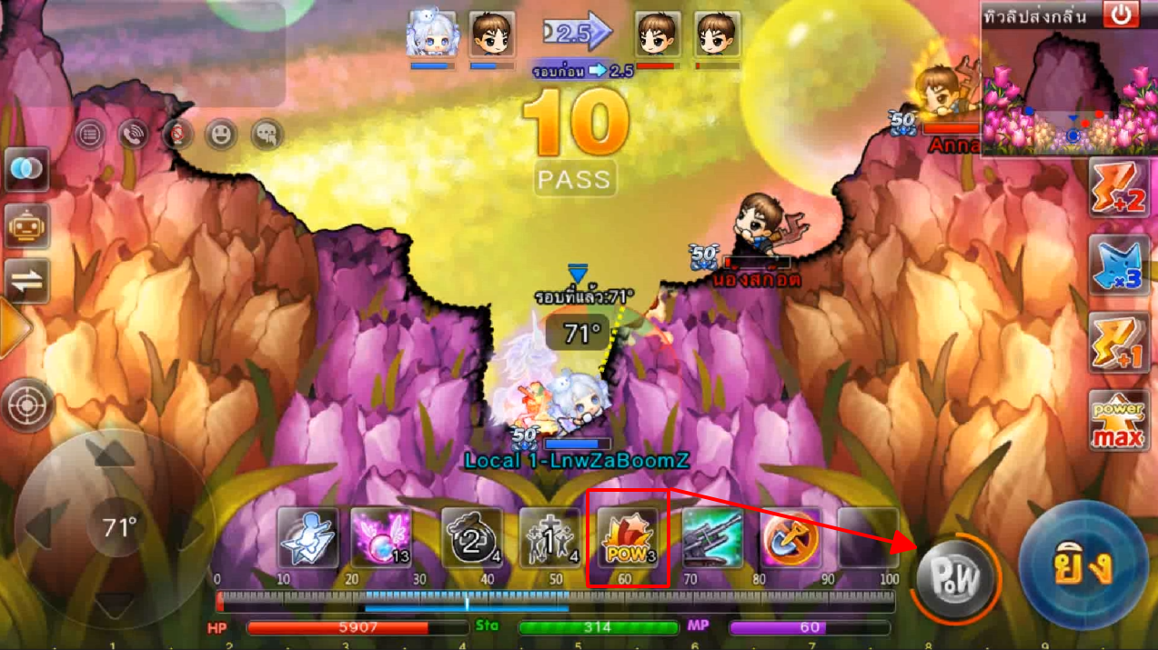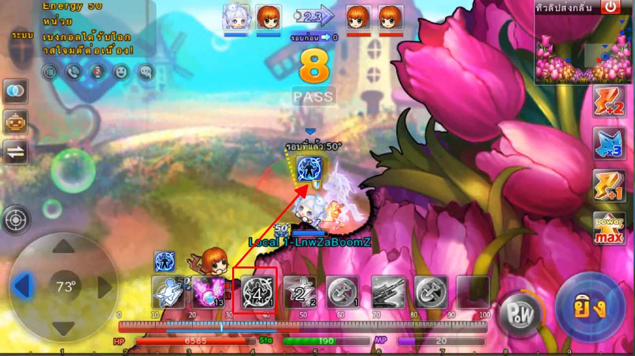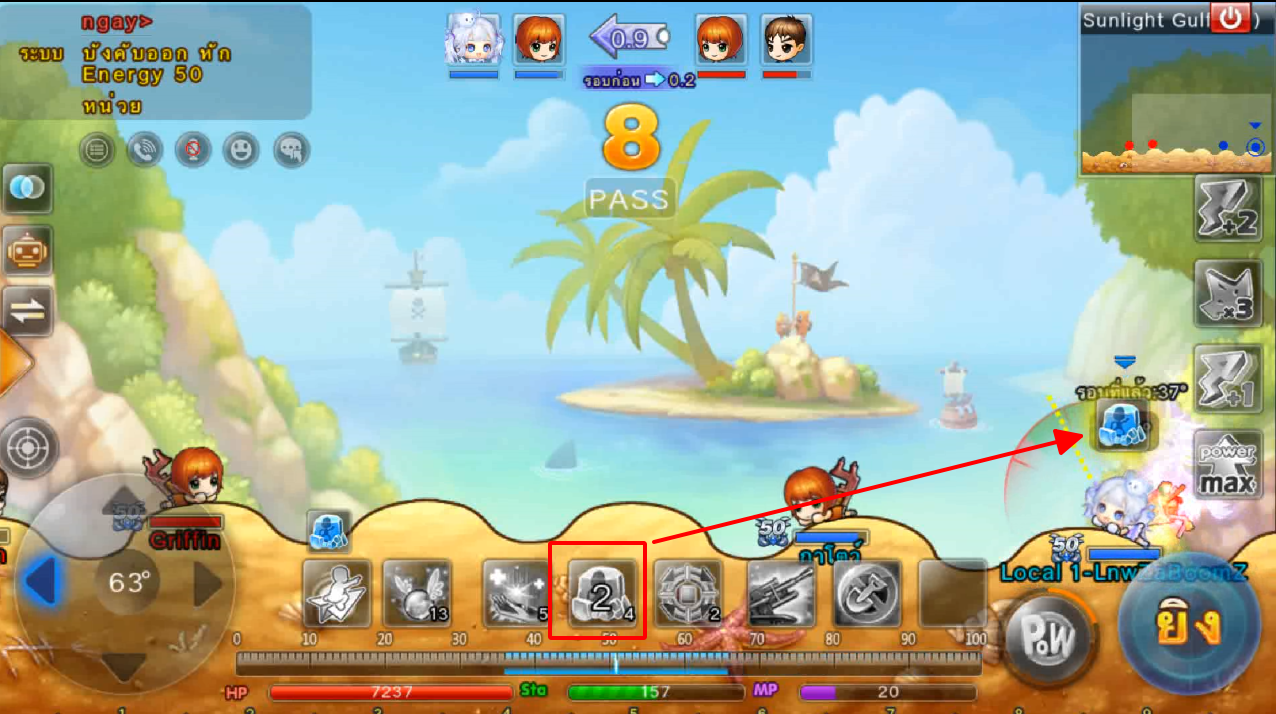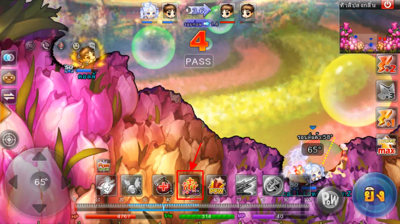 ในภาพใช้สกิลและกดใช้ไอเทม ปา 3 นัด เมื่ออาวุธตกใกล้เป้าหมายจะทำการล็อคเป้าหมายและพุ่งเข้าไปหาเป้าหมายทันที