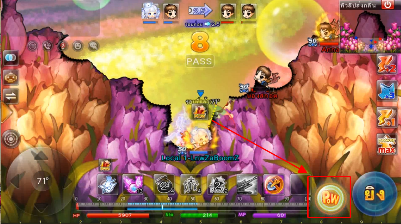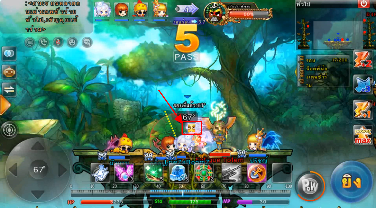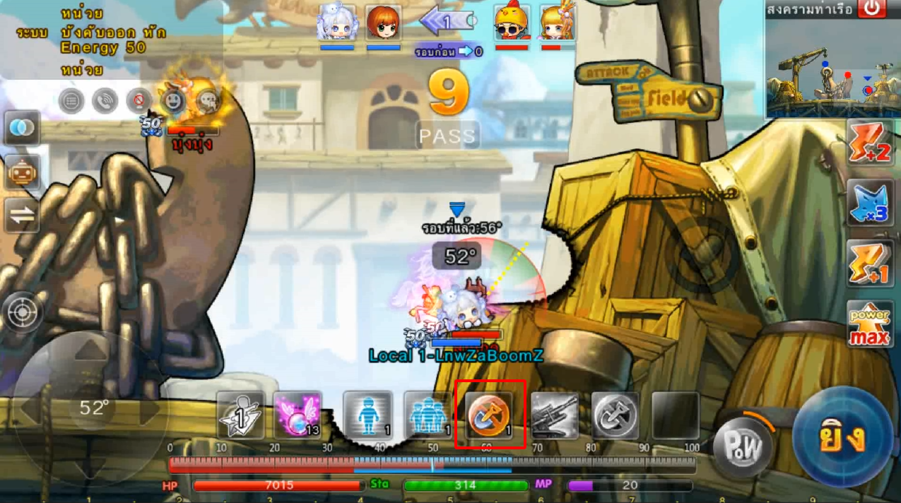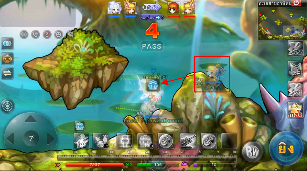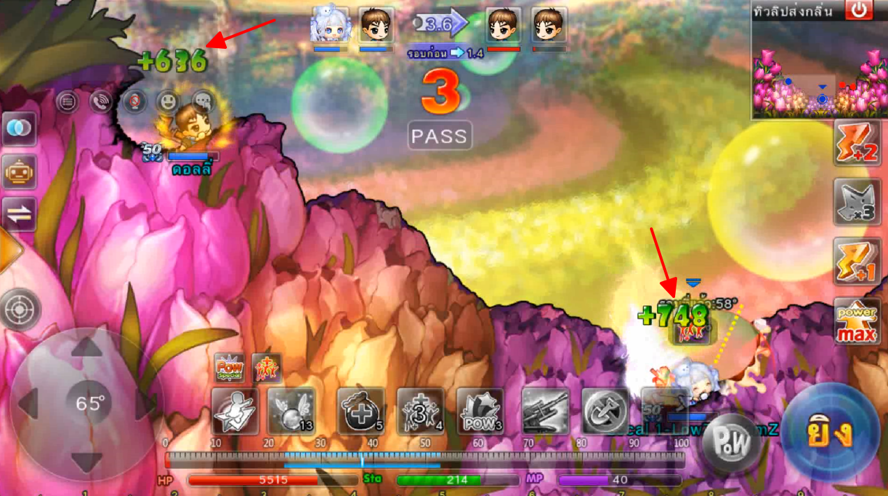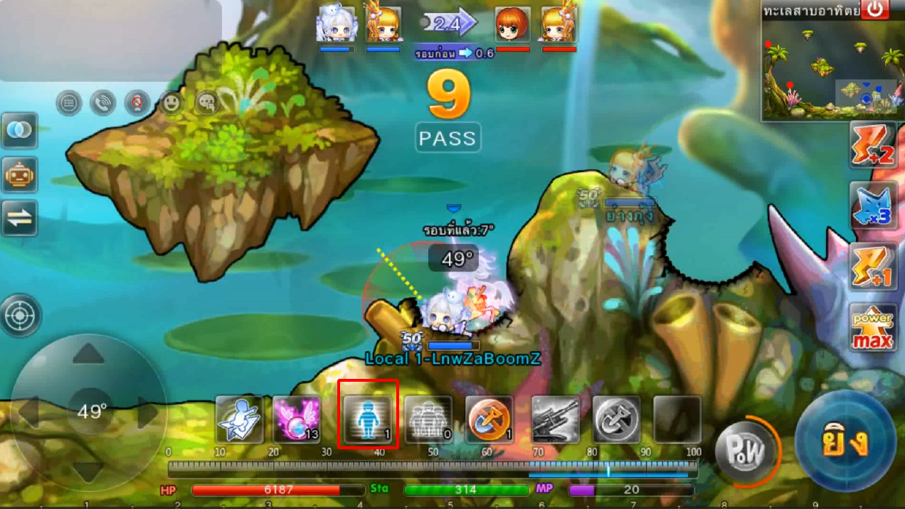 ในภาพใช้สกิลและกดใช้ไอเทม ปา 3 นัด เมื่ออาวุธตกใกล้เป้าหมายจะทำการล็อคเป้าหมายและพุ่งเข้าไปหาเป้าหมายทันที