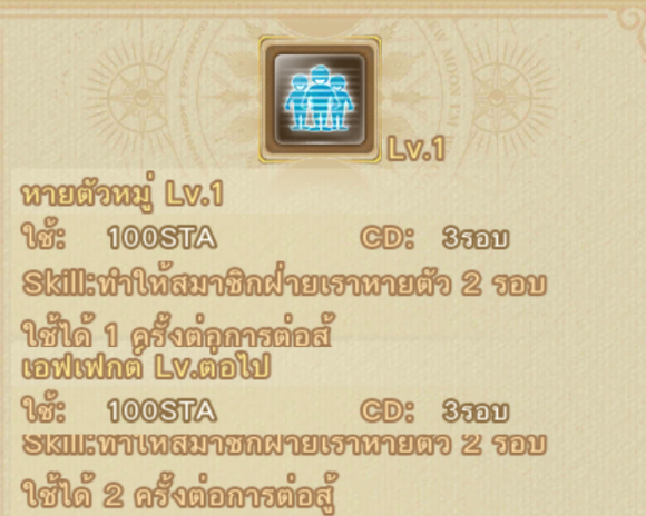 วิธีใช้ เมื่อถึงตาของเรา กดที่สกกิล เมื่อกดใช้งานจะเสีย 100 STA จากนั้นจะเพิ่ม HP ให้กับตัวละครของเรา และ เพื่อนร่วมทีม
