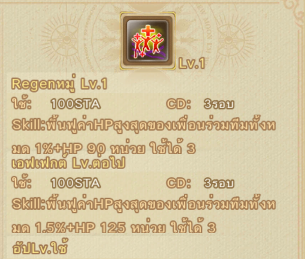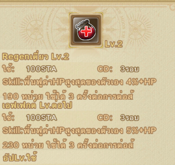 วิธีใช้ เมื่อถึงตาของเรา กดที่สกิล เมื่อกดใช้งานจะเสีย 100 STA จากนั้นจะเพิ่ม HP ให้กับตัวละครของเรา