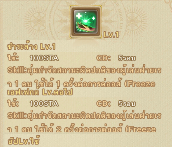 ชำระล้าง : จะเป็นการล้างสถานะผิดปกติของฝ่ายเรา โดยการสุ่มผู้เล่นในทีมตามจำนวนของ Lv.สกิล