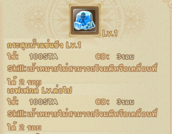 กระสุนน้ำแข็ง : เมื่อใช้สกิลจะเป็นการใช้กระสุนน้ำแข็งปาออกไป เมื่อโดนเป้าหมาย เป้าหมายจะแข็งไม่สามารถขยับหรือโจมตีได้ตามจำนวนรอบที่สกิลกำหนด ยิ่ง Lv.สกิลสูงยิ่งแช่แข็งได้นาน
